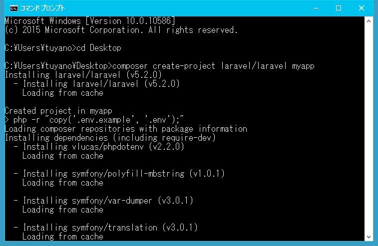 このプロジェクト作成は、コマンドプロンプトを使い、composerコマンドで行います。