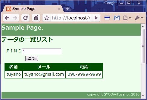 では、簡単なサンプルをあげておきましょう。前回作成したMydataContrllerのindexアクションを修正して、ID番号を送信するとそのIDのデータだけを検索するようにしてみましょう。下に、コントローラーのindexアクションと、index.ctpテンプレートのソースコードを上げておきます。それぞれ書き換えて試してみましょう。