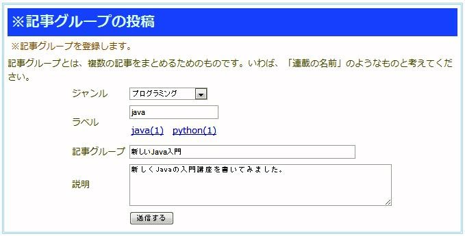 まず最初に作るのは、「グループ」です。これは、いくつかのきじをひとまとめにして管理するもので、いわば「連載の枠組み」のようなものといってよいでしょう。