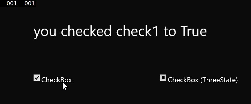 下にそれぞれのメソッドのコードを掲載しておきます。アプリを実行し、2つのチェックボックスを操作してみましょう。チェックの状態がTextBlockに表示されます。