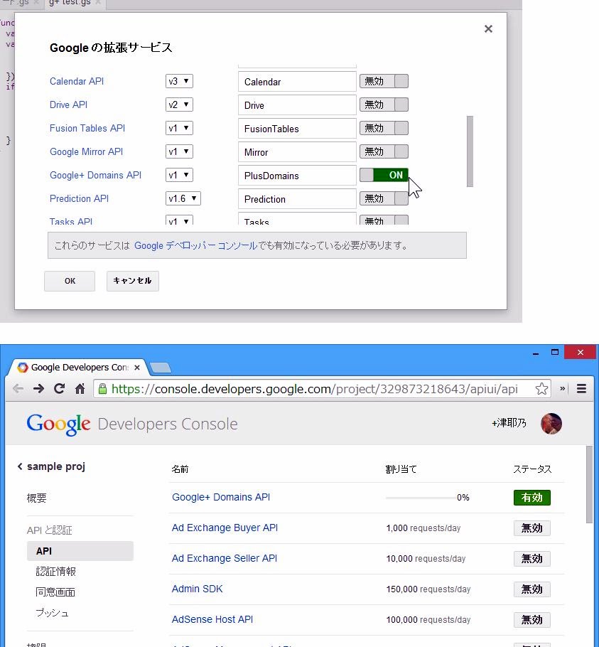 Googleの拡張サービスのダイアログにある「Googleデベロッパーコンソール」のリンクをクリックすると、「Googleコンソール」という開発者向けのコンソールページが現れます。ここで、「Google+ Domains API」を探してONにしてください。