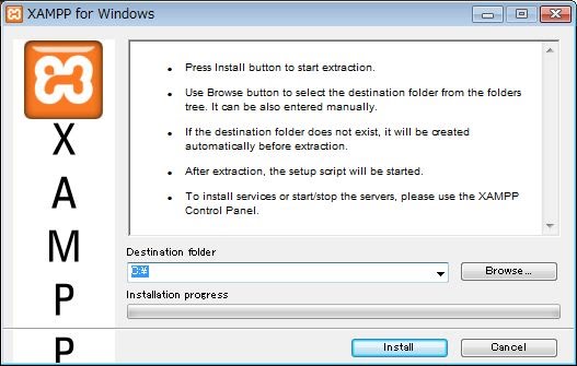 http://www.apachefriends.org/jp/xampp.htmlまずは、このアドレスにアクセスしましょう。これがXAMPPのWebページです。ここから、自分の使っているプラットフォーム向けのXAMPPをダウンロードし、インストールして下さい。Windowsの場合、「XAMPP for Windows」のリンクをクリックし、現れたページにある「XAMPP Windows版」の「EXE」というもの(自己解凍型RARアーカイブというやつです)をダウンロードしましょう。