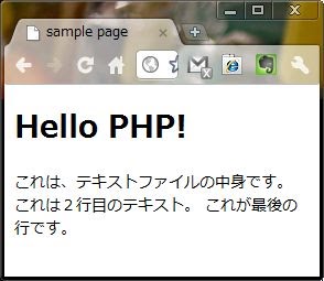 ファイルを用意したら、スクリプトを用意しましょう。index.phpに、下のリストのように記述をします。そしてページにアクセスしてみてください。テキストファイルの中身がそのまま表示されるはずです。