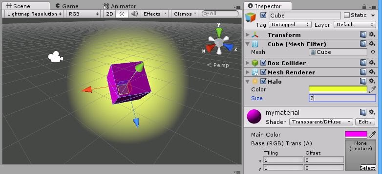 これを選ぶと、そのゲームオブジェクトのインスペクターに「Halo」という項目が追加されます。ここにある以下の項目でハローの表示を設定します。