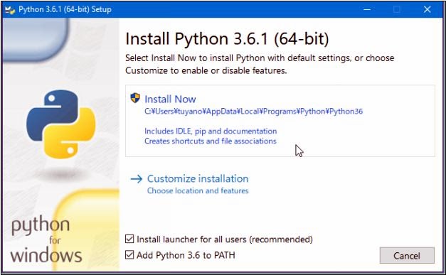 なお、このとき、ウインドウの下に見える2つのチェックボックスは、両方共ONにしておいてください。これを忘れると、後でコマンドプロンプトからPythonコマンドが実行できなくなったりします。