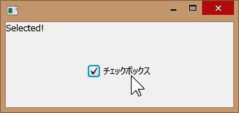 下のリスト欄に、簡単な利用例を挙げておきます。実行するとチェックボックスが1つ表示され、これをクリックするとラベルに「Selected!」「not selected...」と表示されます。