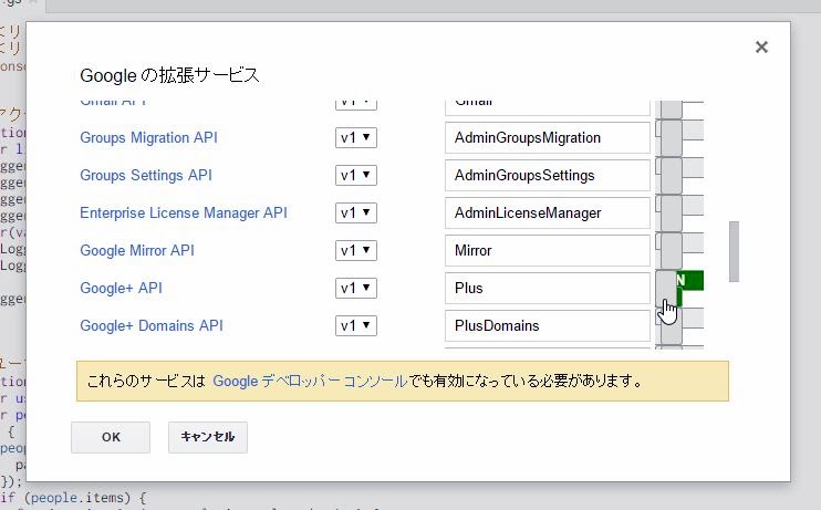 この一覧リストから「Google+ API」という項目を探し、その右端の「OFF」ボタンをクリックしてONに変更して下さい。これで、Google+ APIのオブジェクトがGoogle Apps Scriptから利用できるようになります。――ただし! これだけでは、まだGoogle+ APIは使える状態にはなりません。
