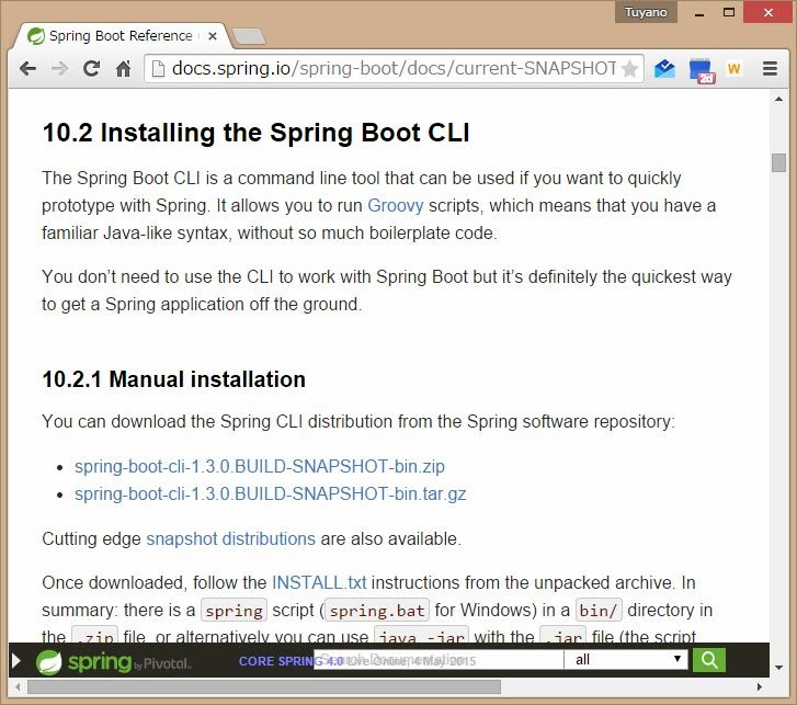 本格的な利用は後でやってみることとして、まずはSpring Boot CLIを使った超簡易アプリ作成を行ってみましょう。Spring Boot CLIは、以下のアドレスからダウンロードできます。