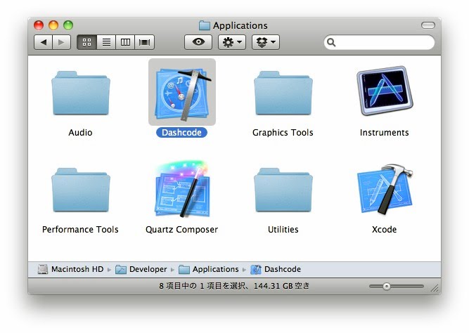 Xcodeをインストールすると、ハードディスクに「Developer」というフォルダが作られ、その中に「Applications」というフォルダの中にアプリケーションがまとめられます。ここに「Dashcode」アプリが保管されています。これをダブルクリックして起動し、Webアプリの作成を行います。