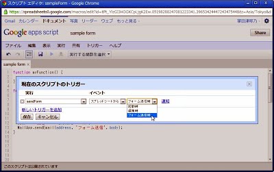 記述をしたら、トリガーの設定を行います。<トリガー><現在のスクリプトのトリガー...>メニューを選び、現れたダイアログで「……今すぐ追加するにはここをクリックしてください」リンクをクリックし、新しいトリガーを作成してください(既にトリガーがある場合は、「新しいトリガーを作成」というリンクになります)。そして以下のように設定を行います。