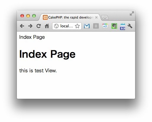 http://localhost/[cakephpディレクトリ]/sample/アクセスすると、簡単なテキストだけの画面が表示されます。とりあえずソースコードの中身は後回しにして、ちゃんと表示されるかどうか確認をしましょう。