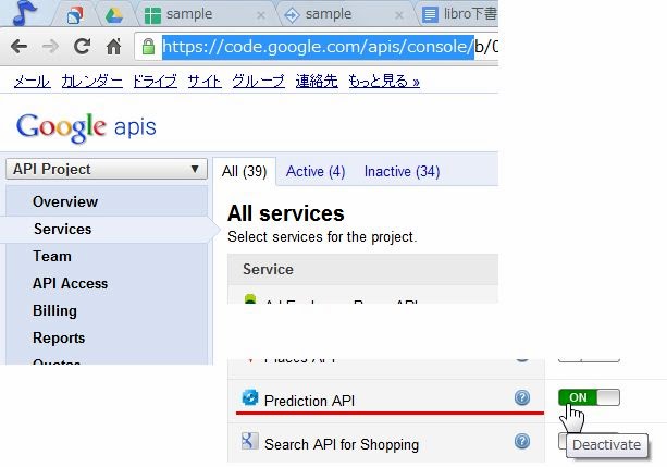 まずは、Prediction APIを使えるようにしましょう。このAPIは、デフォルトではOFFになっています。Google API Consoleにアクセスしてください。
