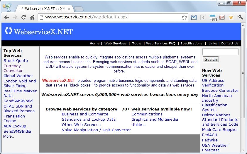http://www.webservicex.net/ここではさまざまなSOAPサービスが公開されており、WSDLによるXMLドキュメントとして問い合わせ結果を取り出し利用することができるようになっています。