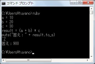 スクリプトの内容は後ほど説明するとして、このようにしてその場でスクリプトを記述し実行することがRubyではできるのです。あまり一般的な方法ではありませんが、「ちょっとスクリプトを試したい」というときには便利な機能ですね。
