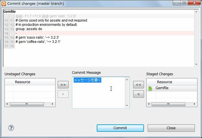 コミットと呼ばれる作業を行うことで修正をgitが引き受けることになります。Aptana Studioでは、